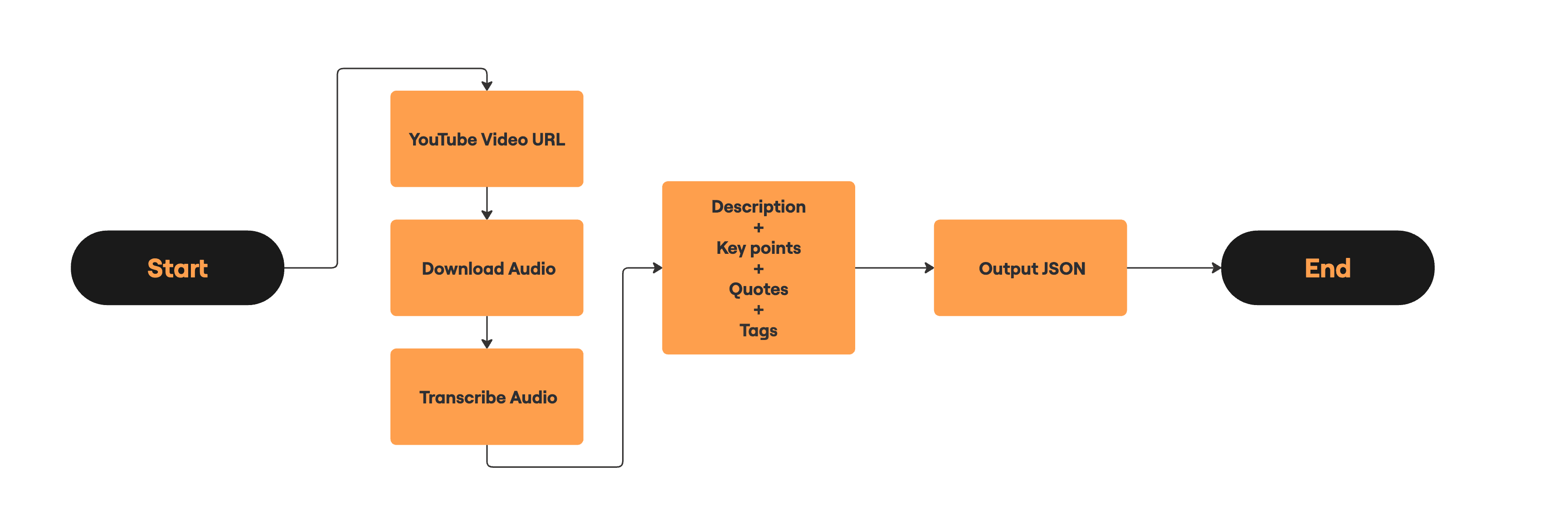 Accepting a YouTube video URL —> Downloading the audio using yt-dlp —> Transcribing the audio to text using OpenAI’s Whisper —> Sending the transcript to Anthropic’s Claude 4 Sonnet model API to:
